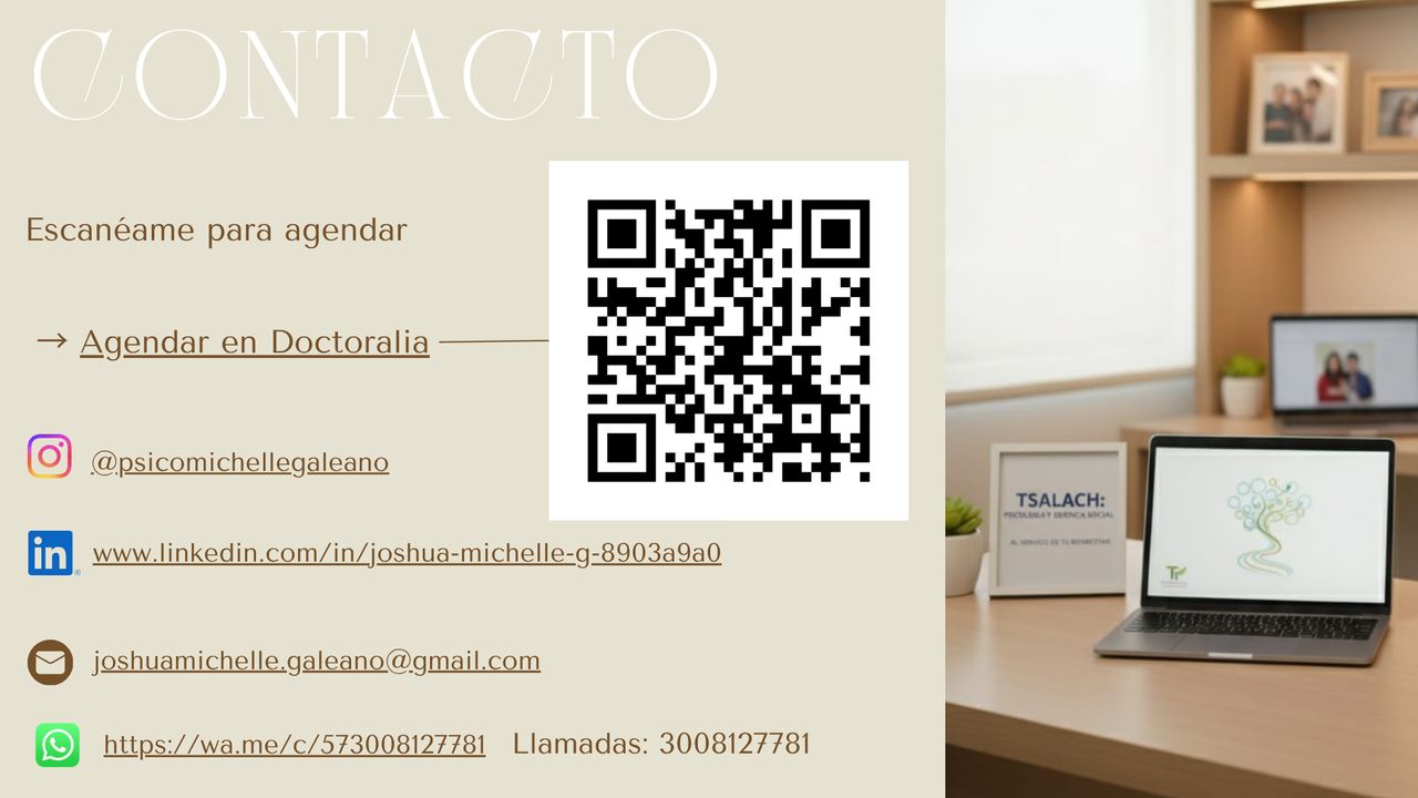 Atiendo a niños, adolescentes, adultos, parejas y familias, en modalidad online (Colombia e internacional) y presencial bajo agenda.